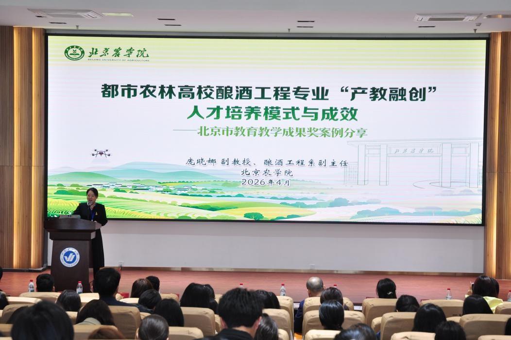 论坛上,食品学院酿酒工程系副主任庞晓娜受邀作专题汇报。她以“都市农林高校酿酒工程专业产教融创人才培养模式与成效——北京市教育教学成果奖案例分享”为题,介绍了酿酒工程专业通过构建三产融合培养体系和产教融创特色实践平台,立足首都区位优势,发挥“三维立体”国际化协同,凝练出“四阶驱动”教学法,构建了多元化人才培养新模式,在赋能产业发展与乡村振兴方面做出了突出贡献,扎实的案例赢得了与会同行的高度认可与一致赞誉。